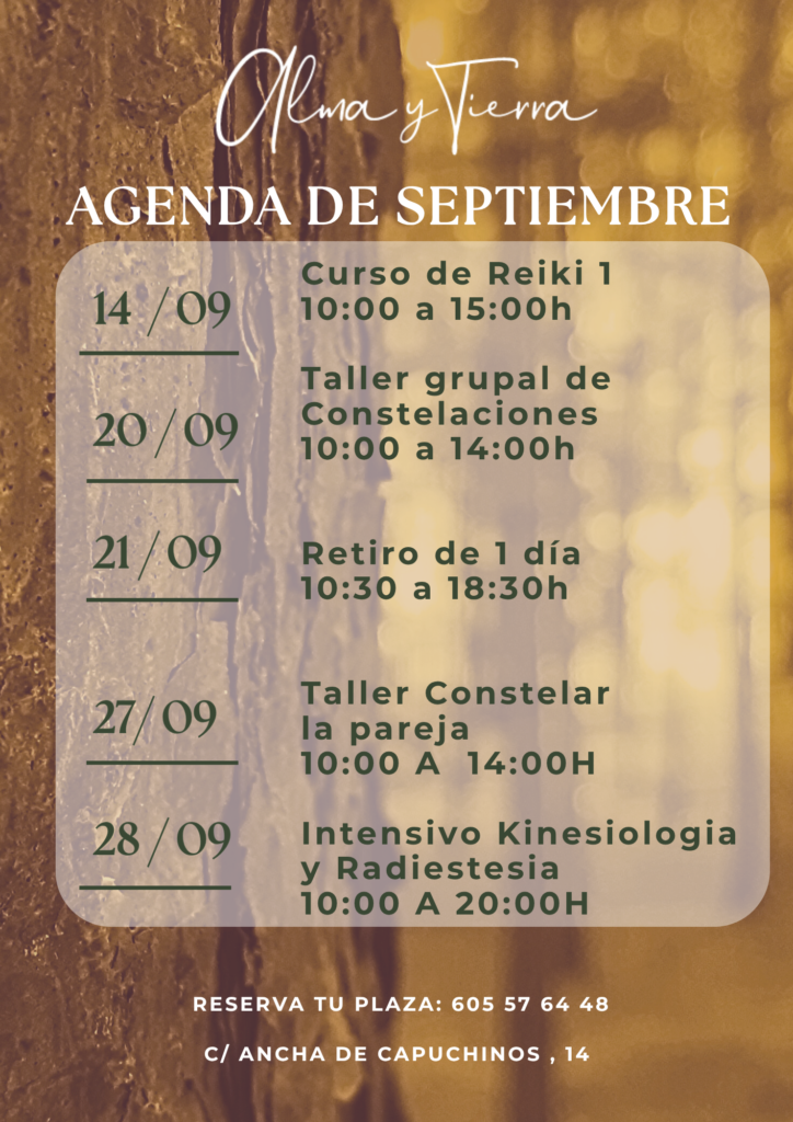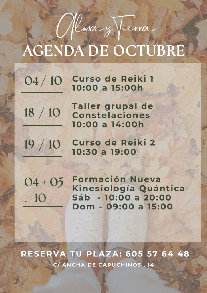 Ya tenemos preparada la AGENDA DE OCTUBRE con todos los cursos y actividades que ofrecemos. Si quieres más información sobre alguno de ellos, puedes dejarnos un Whatsapp al 605576448, o email a : almaytierragranada@gmail.com